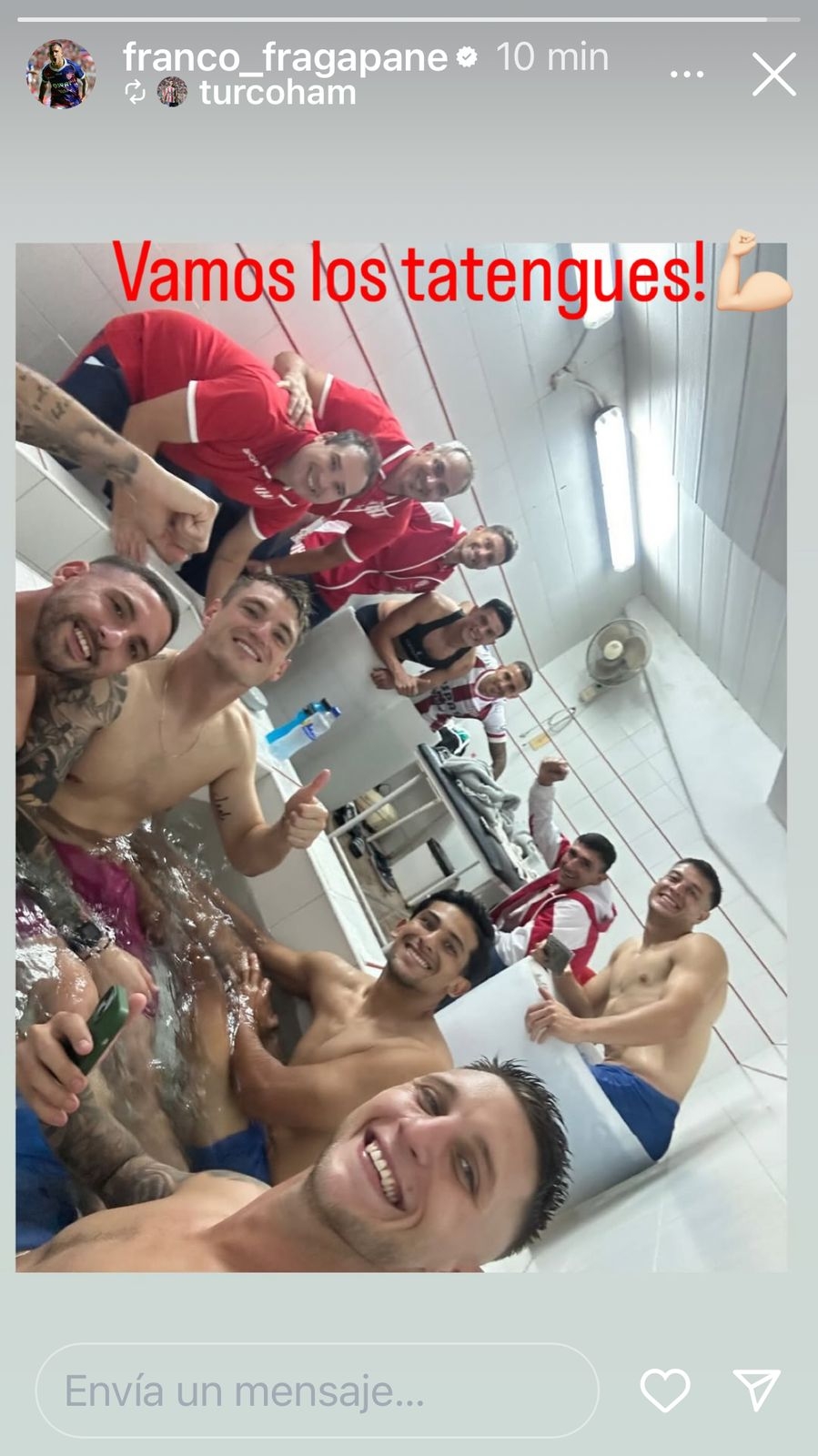Luego del partido, los festejos se vieron fuera y dentro del 15 de Abril, entre ellos el de Franco fFragapane vestuario tatengue: