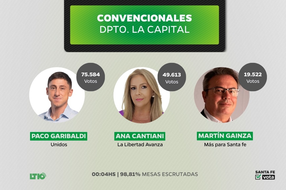 En el caso del departamento La Capital, con un 98,81% escrutado, Paco Garibaldi por Unidos para Cambiar Santa Fe se quedó con la mayor cantidad de votos al sumar 75.584 votos, un 36,47%.