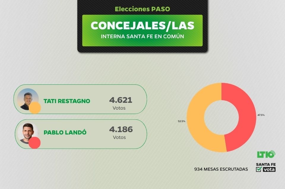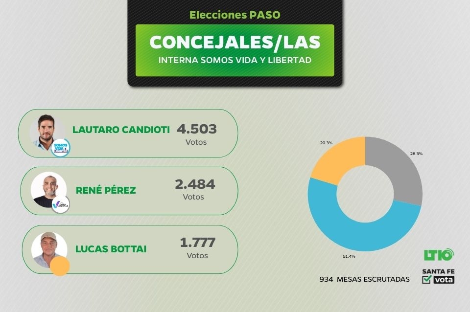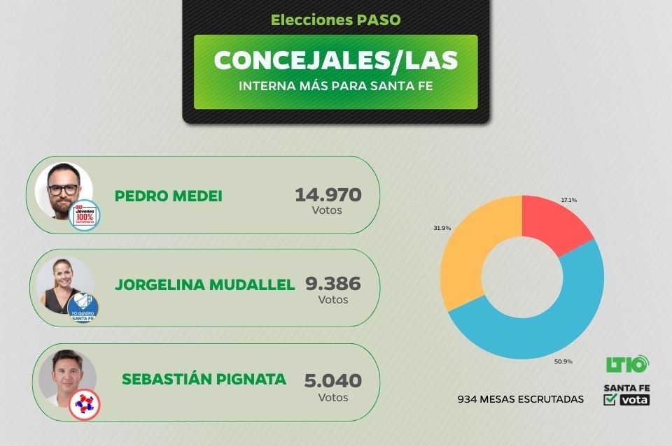 El tercer lugar lo ocupa Pedro "el profe" Medei con 15.052 votos, quien se queda hasta el momento con la interna de Más para Santa Fe, al superar a Jorgelina Mudallel (9.423 votos) y Sebastián Pignata (5.047).