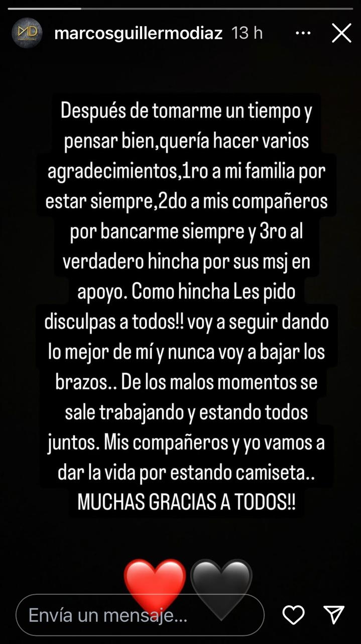 Frente a la creciente presión, Marcos Díaz decidió romper el silencio. A través de una historia en su cuenta de Instagram, el arquero compartió un mensaje en el que asumió la responsabilidad por su rendimiento y le habló directamente al hincha. “Después de tomarme un tiempo para pensar, quería agradecer a mi familia, a mis compañeros por bancarme siempre y al verdadero hincha por sus mensajes de apoyo”, comenzó escribiendo.
