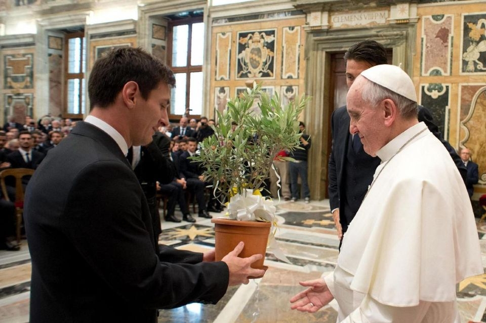 El Papa recibió a ambos planteles en el Vaticano y le entregó a Messi y a Gianluigi Buffon, capitán de la selección de Italia por aquel entonces, un ramo de olivos como símbolo de paz.