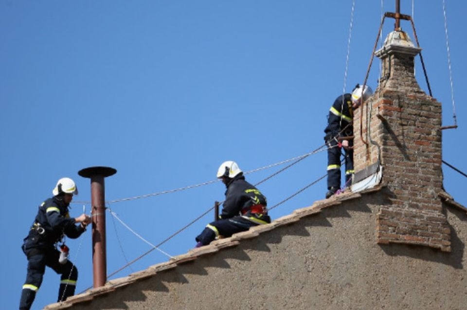 Unos cinco bomberos de la Santa Sede subieron al tejado del majestuoso edificio para colocar el humero y pasaron desapercibidos para los muchos turistas que visitaban la plaza de San Pedro, aunque algunos lo notaron y subieron videos a las redes sociales.