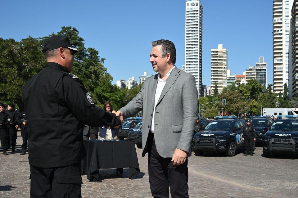 El gobierno provincial entregó este viernes 117 camionetas 0 km destinadas al departamento Rosario. El acto fue encabezado por el ministro de Justicia y Seguridad, Pablo Cococcioni, y se desarrolló en la Colectora de Avenida Belgrano, a la altura del Monumento Nacional a la Bandera.