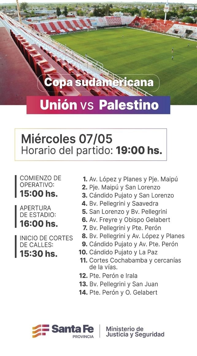 Este miércoles, el estadio 15 de Abril será escenario del partido entre Unión y Palestino de Chile, por la fecha 4 del Grupo E de la Copa Sudamericana. Con motivo del encuentro, que comenzará a las 19, con arbitraje del paraguayo Derlis López y transmisión de LT10 AM 1020 y FM "X" 103.5, el Ministerio de Justicia y Seguridad de la Provincia de Santa Fe informó sobre el operativo de seguridad y cortes de tránsito en las inmediaciones del estadio.