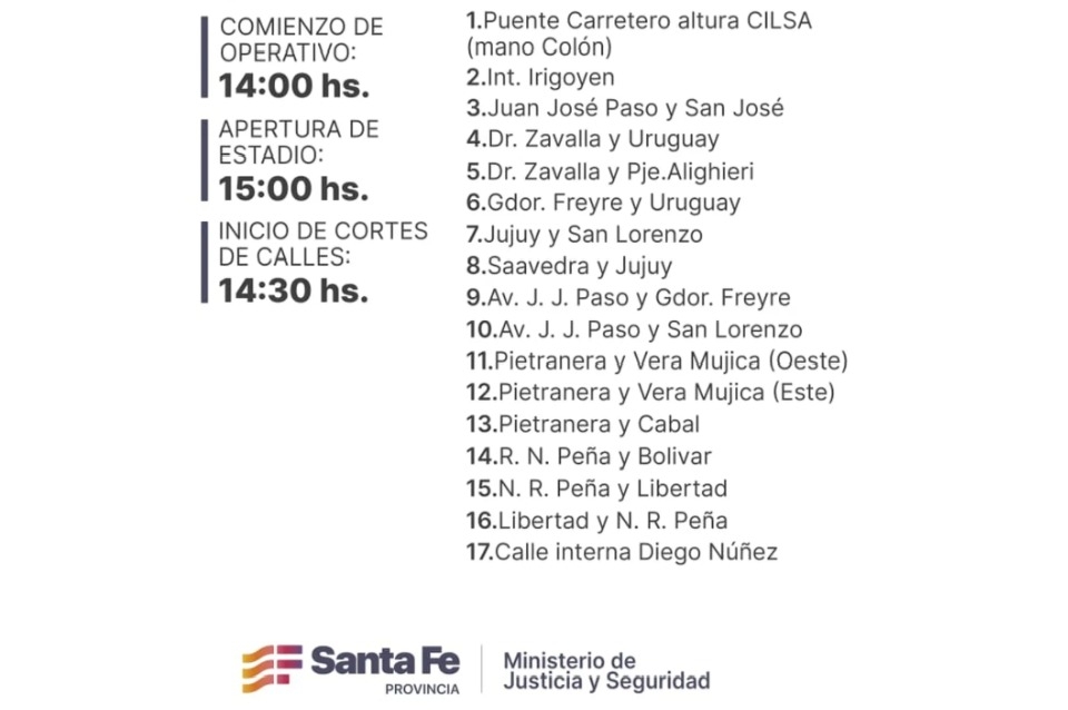 El operativo de seguridad dará inicio en la tarde del domingo, a las 14, con un registro previo del perímetro externo del estadio Brigadier López, para luego inspeccionar el interior. La "apertura de puertas" para el ingreso de hinchas será a partir de las 15, mientras que el inicio de cortes y desvíos de calles será desde las 14:30.