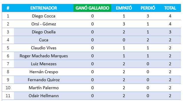 El caso más llamativo es el de Diego Osella, exentrenador de Colón, quien enfrentó tres veces a Gallardo y jamás perdió: dos empates y una victoria lo posicionan como uno de los pocos técnicos con ese registro positivo frente al multicampeón DT. Osella, con estilo pragmático y ordenado, logró neutralizar al River de Gallardo en sus distintas etapas.