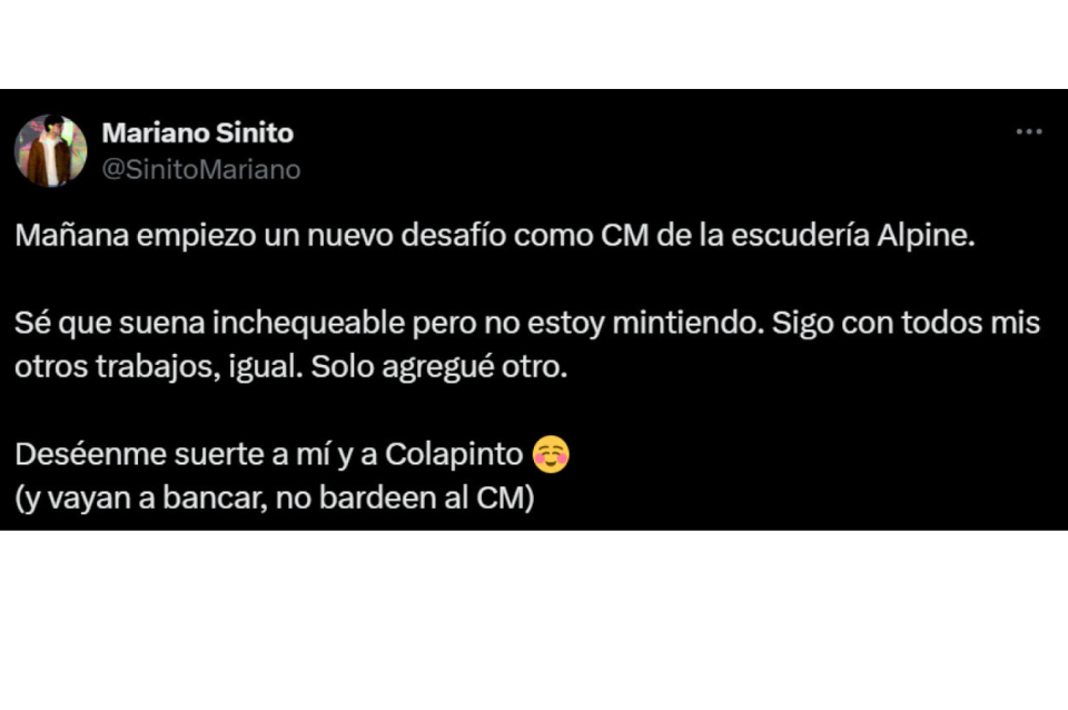 La noticia fue confirmada por el propio Sinito en sus cuentas hace unos días: “Mañana empiezo un nuevo desafío como CM de la escudería Alpine. Sé que suena inchequeable, pero no estoy mintiendo”, escribió en X (ex Twitter). Y con humor agregó: “Deséenme suerte a mí y a Colapinto (y vayan a bancar, no bardeen al CM)”.