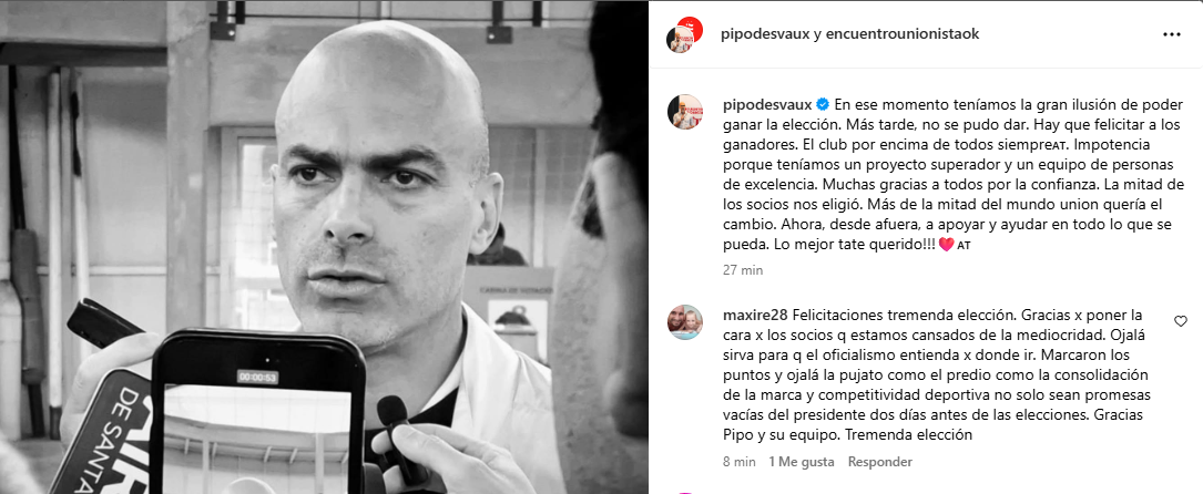 A pesar de la derrota, Desvaux destacó un dato importante: la mitad de los socios lo eligieron como opción. “La mitad de los socios nos eligió. Más de la mitad del mundo unionista quería el cambio”, expresó, un dato que no pasó desapercibido, ya que resalta el apoyo significativo que recibió de los hinchas y asociados del club.