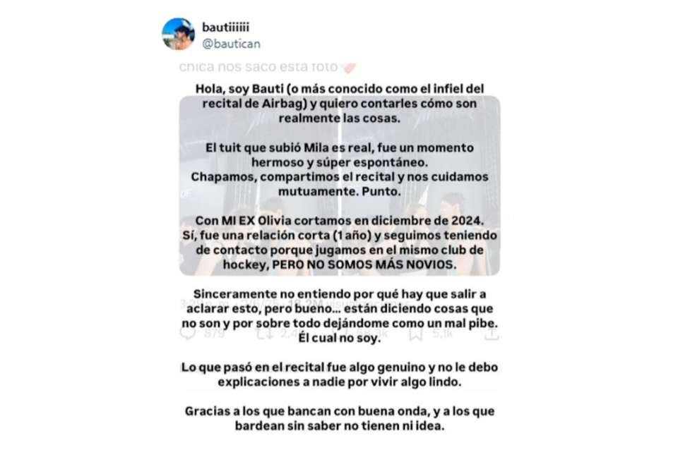 Ahora, quien rompió el silencio fue Bauti, el otro protagonista del beso viral. A través de sus redes, publicó un comunicado en el que dio su versión de los hechos: “Hola, soy Bauti (o más conocido como el infiel del recital de Airbag) y quiero contarles cómo son realmente las cosas”.
