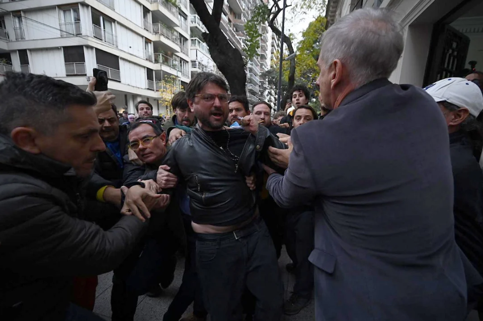 Durante la ocupación, los manifestantes colgaron banderas desde los balcones con consignas como “Defendamos nuestra historia” y “Si no podés elegir, no hay democracia”. La situación escaló cerca de las 17 horas, cuando un operativo de infantería de la Policía Federal avanzó con el desalojo. Hubo empujones, uso de gas pimienta e incidentes. Grabois fue detenido y trasladado a una comisaría, desde donde posteó en redes: “Meteme preso Milei, pero la bandera argentina no me la sacás”, acompañando el mensaje con una foto desde el móvil policial.