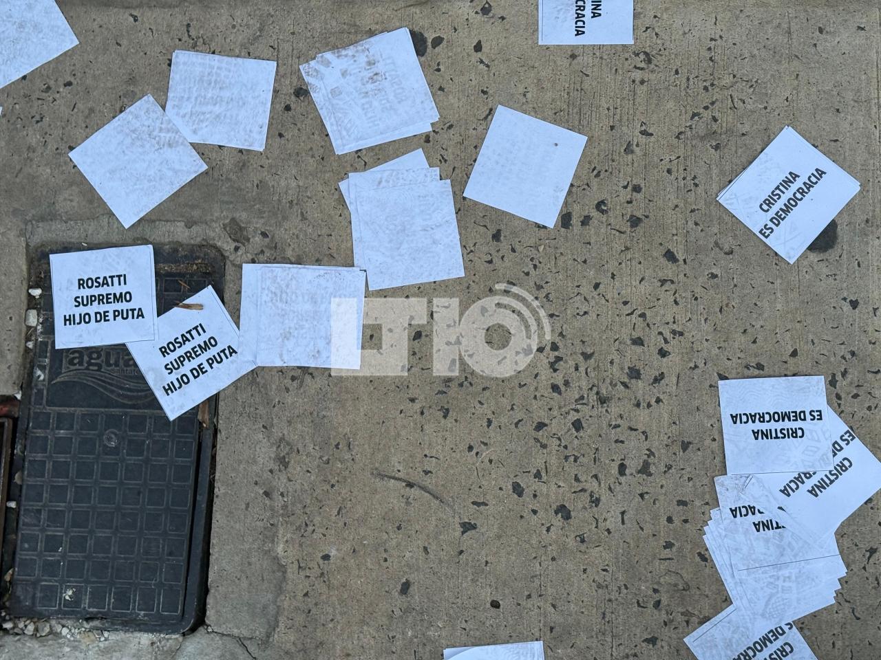 Según informaron desde el Móvil de LT10, los mismos fueron arrojados por una persona a bordo de una motocicleta pasada la medianoche. Los papeles blancos, rezan con letra negra: “Cristina es democracia”, y otro con ofensas a Horacio Rosatti.