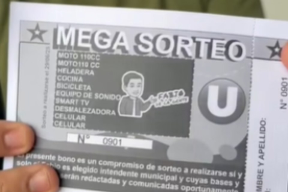 "Tenemos una gran noticia para mañana. Mañana es domingo, día de elecciones. Y te quiero contar lo que tenemos para sortear para festejar mañana cuando ganamos" sostenía el candidato a Intendente como si estaría presentando un programa televisivo. Además, a lo largo del video remarcan que la entrega de los premios se hará solamente bajo la condición prioritaria: “Solo tiene que ganar él”.