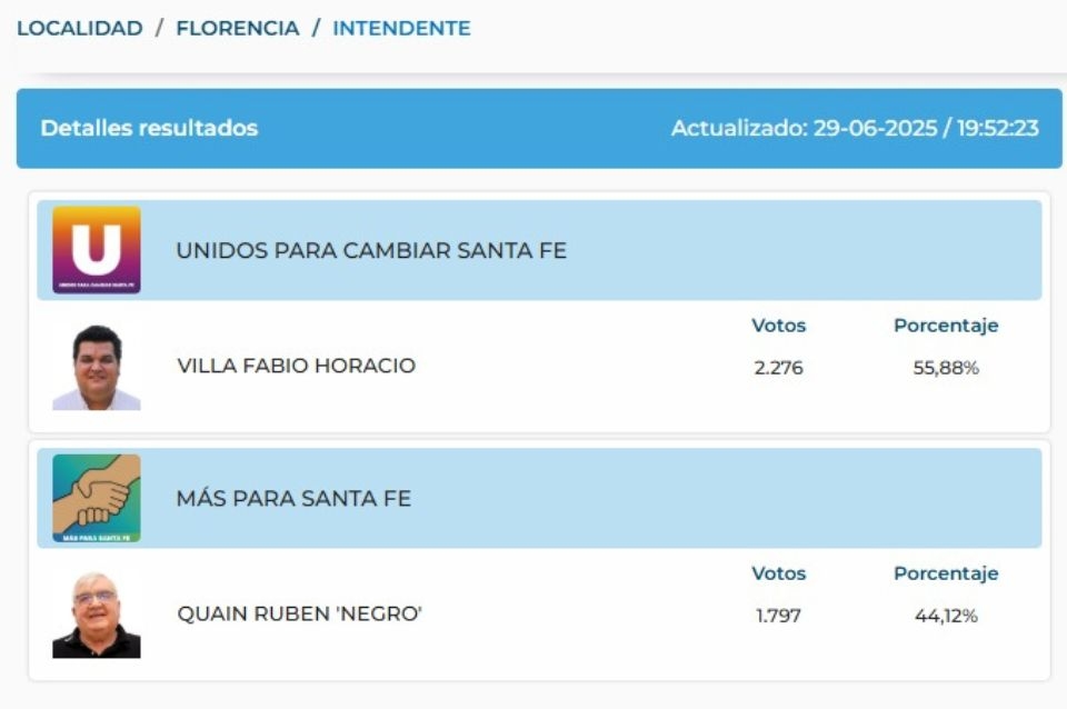 Tras el escándalo protagonizado por uno de los candidatos, finalmente el postulante de la lista del oficialismo "Unidos para Cambiar Santa Fe", Fabio Villa, se impuso con el 55,88% logrando un total de 2.276 votos en las elecciones. De esta manera, desplazó del mandato al histórico Intendente del justicialismo Rubén "Negro" Quain, que se quedó con un 44,12% del porcentaje de los votos.