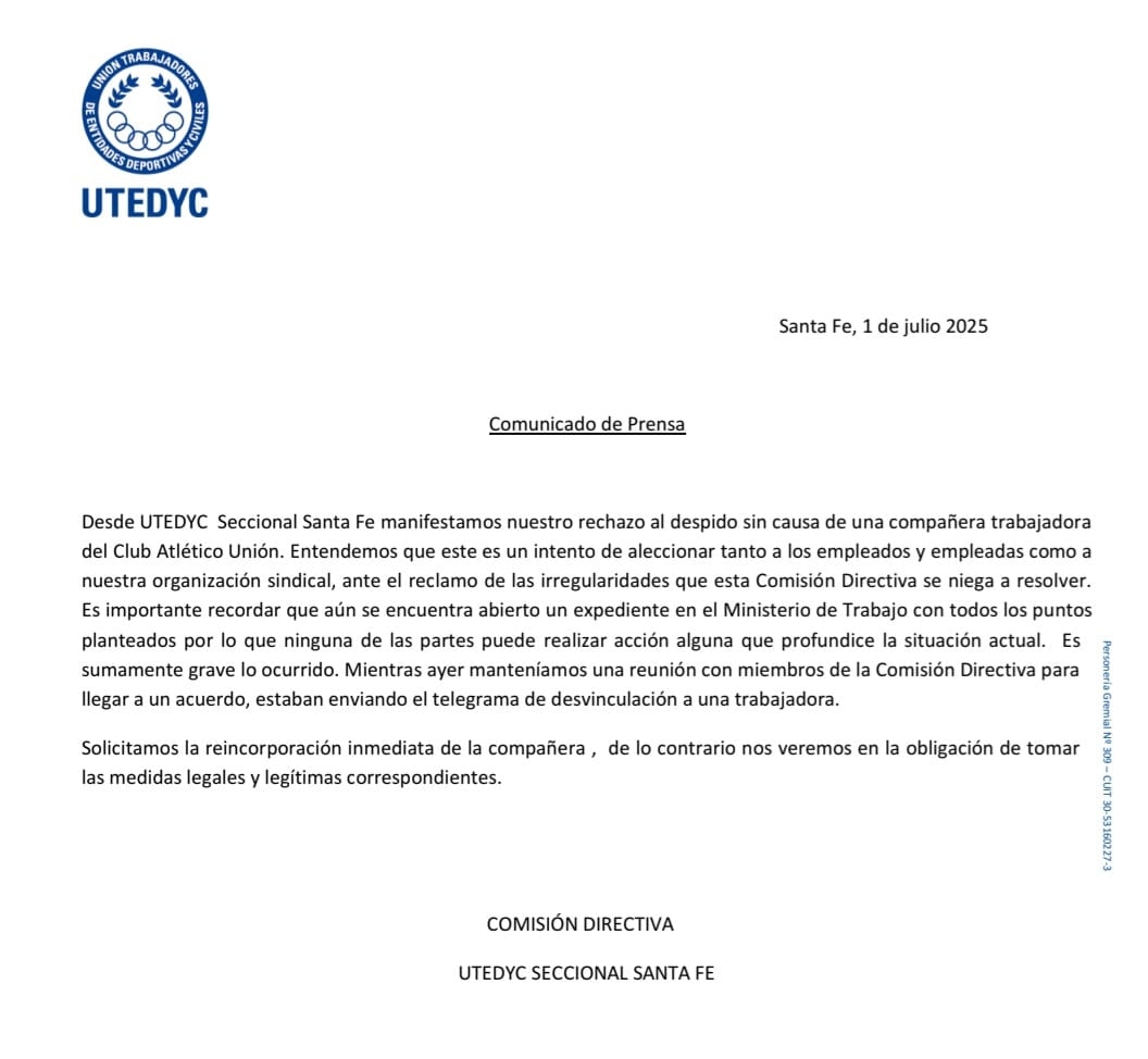 Lo que más agravó la situación, según remarcó UTEDYC, fue el contexto en que se produjo el despido: mientras el gremio mantenía una reunión con dirigentes de Unión para tratar de destrabar el conflicto, desde el club enviaban el telegrama de desvinculación a una empleada.