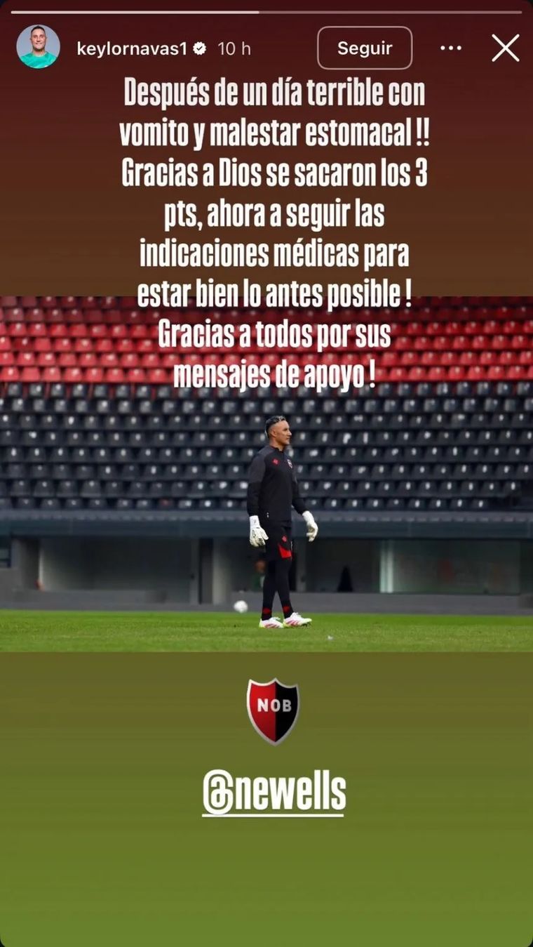 A través de Instagram, el arquero publicó: “Después de un día terrible con vómitos y malestar estomacal. Gracias a Dios se sacaron los 3 puntos. Ahora a seguir las indicaciones médicas para estar mejor lo antes posible. Gracias a todos por sus mensajes de apoyo”. Sin embargo, en el entorno de Newell’s creen que fue una excusa para no viajar.