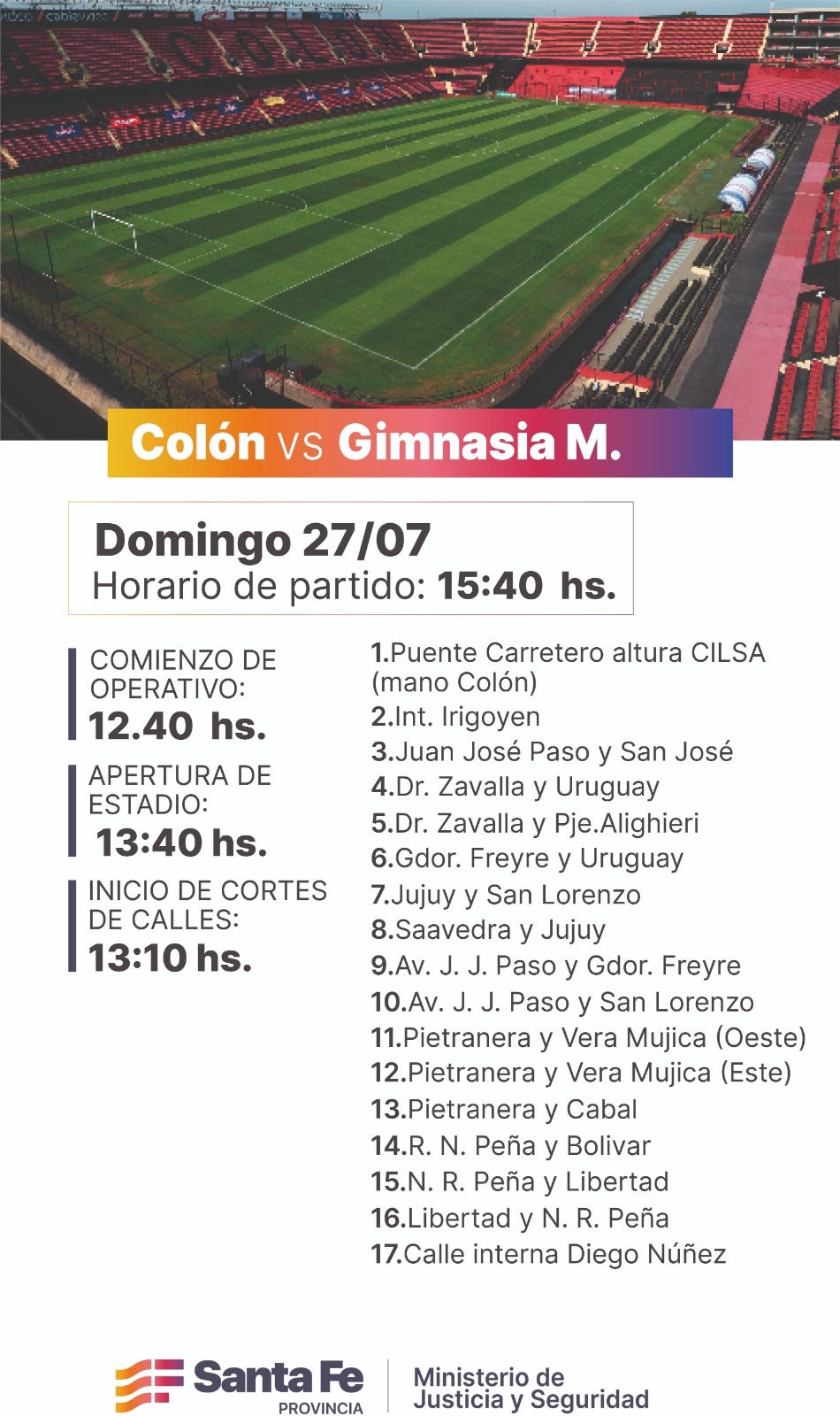 El Ministerio de Justicia y Seguridad de Santa Fe confirmó el operativo especial para el partido entre Colón y Gimnasia de Mendoza, que se disputará este domingo, a las 15.40, con arbitraje de Pablo Dóvalo y transmisión de LT10 AM 1020 y FM "X" 103.5, en el estadio Brigadier López, por la fecha 24 del Grupo B de la Primera Nacional.