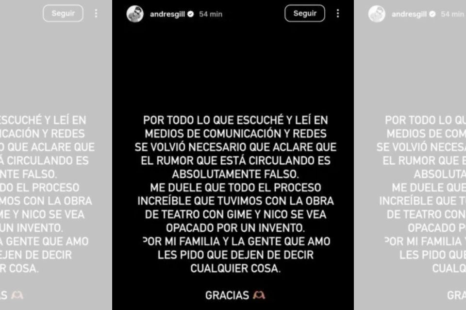 El actor remarcó además su malestar por el impacto que los rumores generaron en el ámbito laboral: “Me duele que todo el proceso increíble que tuvimos con la obra de teatro con Gime y Nico se vea opacado por un invento. Por mi familia y la gente que amo les pido que dejen de decir cualquier cosa. Gracias”.