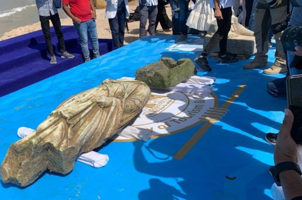 Tras algunos minutos de maniobras, emergieron varias piezas parcialmente conservadas, entre ellas una estatua decapitada de época ptolemaica y la base de otra perteneciente a un noble romano.