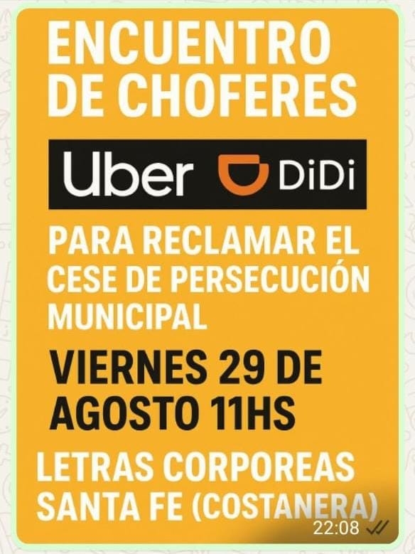La misma también incluye a pasajeros, y es con el objetivo de pedir "el cese de la persecución municipal de estos últimos días donde los conductores de estas aplicaciones son tratados y perseguidos como delincuentes".