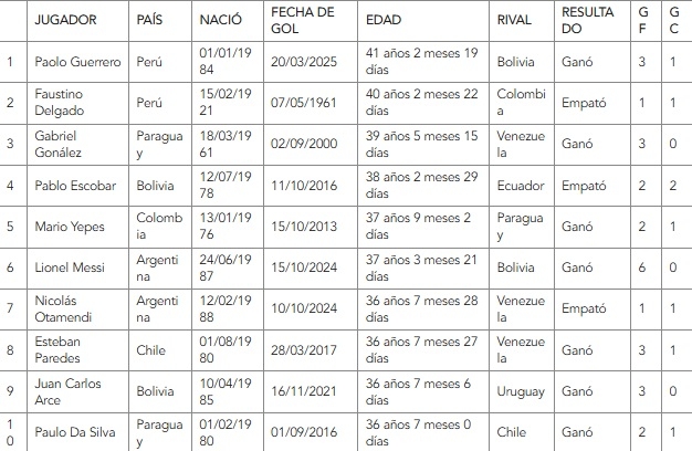 Un hito histórico que posee el delantero peruano Paolo Guerrero: un gol con 41 años, 2 meses y 19 días. El extremo rosarino tendrá la posibilidad de sumar un gol con 37 años y 81 días. Sin embargo, no entrará en el top 3 de los goleadores más veteranos de las Eliminatorias sudamericanas.