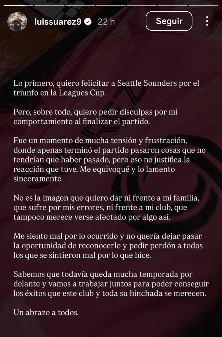 Claro, porque el repudiable accionar del delantero uruguayo quedó captado por las cámaras de la transmisión y rápidamente se viralizó en las redes sociales, generando comentarios de todo tipo en contra el Pistolero. Hasta el momento, el ex Barcelona y Liverpool no se había expresado al respecto, pero en las últimas horas rompió el silencio y utilizó su cuenta de Instagram para pedir sus más sinceras disculpas.