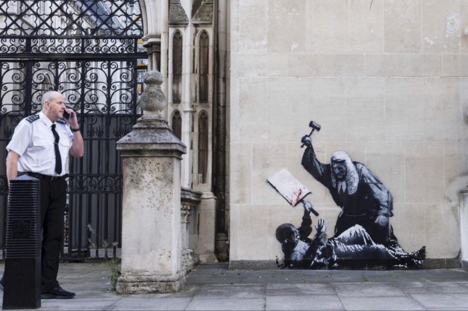 El mural apareció el lunes y representa a un manifestante tendido en el suelo sosteniendo un cartel salpicado de sangre, mientras un juez con una peluca tradicional y una toga negra lo golpea con un mazo. Banksy publicó una foto de la obra en Instagram, su método habitual para reclamar una obra como auténtica. Llevaba el pie de foto “Royal Courts Of Justice. London” (Corte Real de Justicia. Londres).
