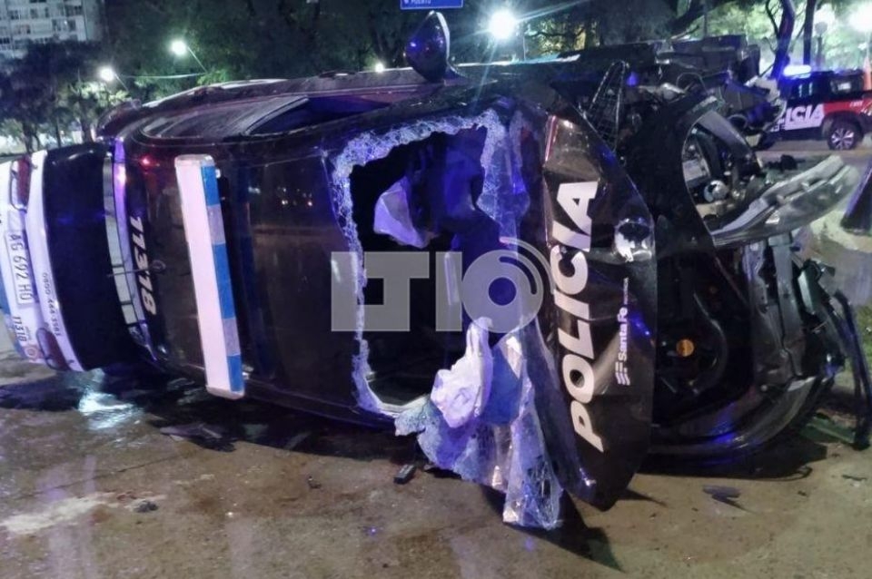 En avenida Alem y San Luis, uno de los móviles chocó contra una columna de alumbrado, dejando a dos agentes heridos que debieron ser trasladados al Hospital Cullen.