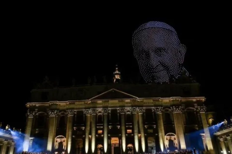 Formado por drones, iluminó el cielo de la Plaza San Pedro durante un evento por la fraternidad con Karol G y Andrea Bocelli.