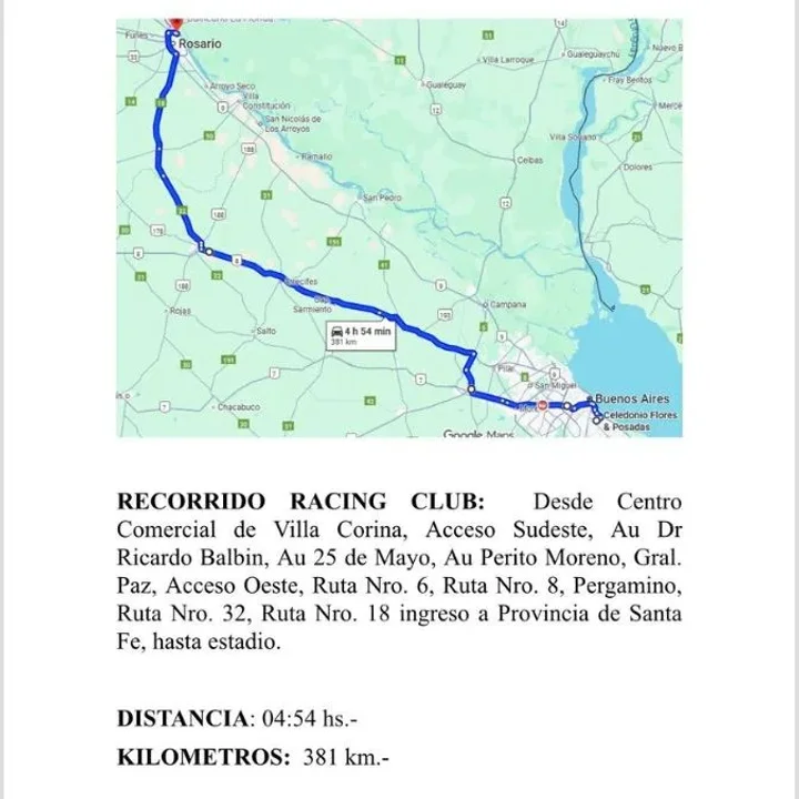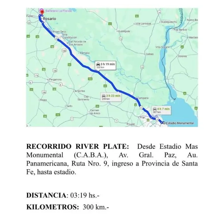 En tanto, los hinchas de River, que tendrán un recorrido más corto de 300 kilómetros en tres horas y veinte minutos, partirán desde el estadio Monumental. El trayecto oficial será por Avenida General Paz hasta la Panamericana, y luego por la Ruta 9 directo hacia la provincia de Santa Fe, para llegar a Rosario Central.