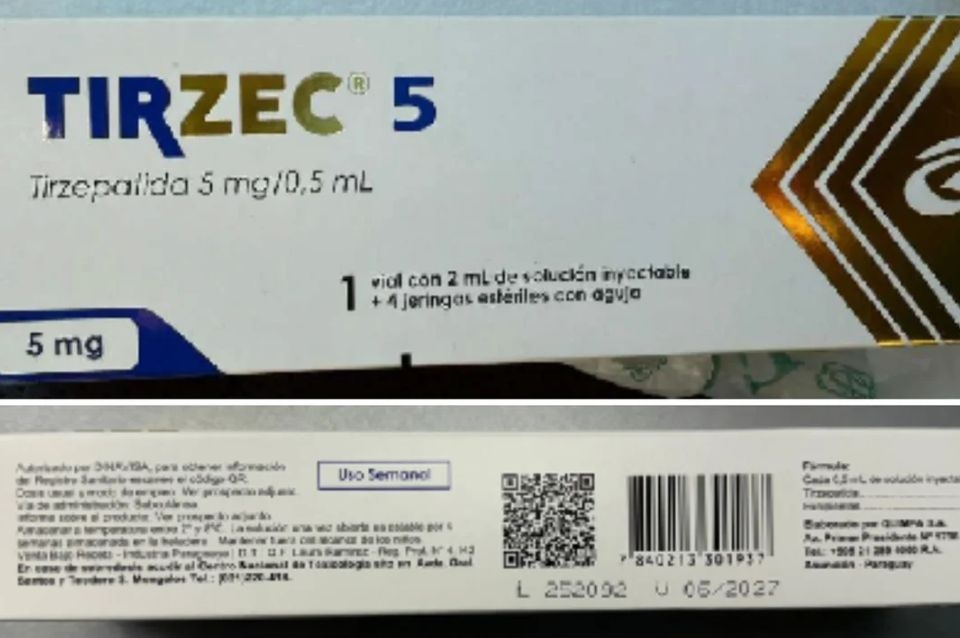 Las autoridades de la ANMAT tomaron conocimiento, por medio de la firma Adium, de la venta del medicamento «TIRZEC® tirzepatida 5 mg/0.5 ml, L 252092, V 06/2027, Quimfa SA» en una farmacia ubicada en Pilar, provincia de Buenos Aires.