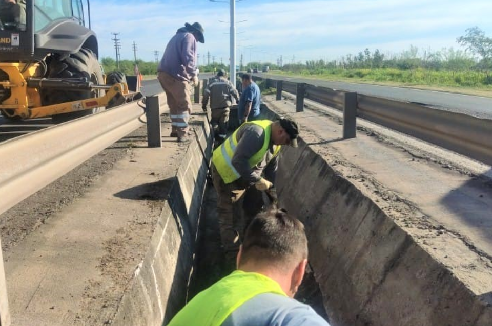 En la Circunvalación Oeste de la Ruta Nacional 11, los trabajadores viales finalizaron la limpieza y desobstrucción del canal de desagüe en el cantero central, a la altura de calle Mendoza. La presencia de equipos y personal obligó a la reducción del carril central, delimitado con conos de seguridad.