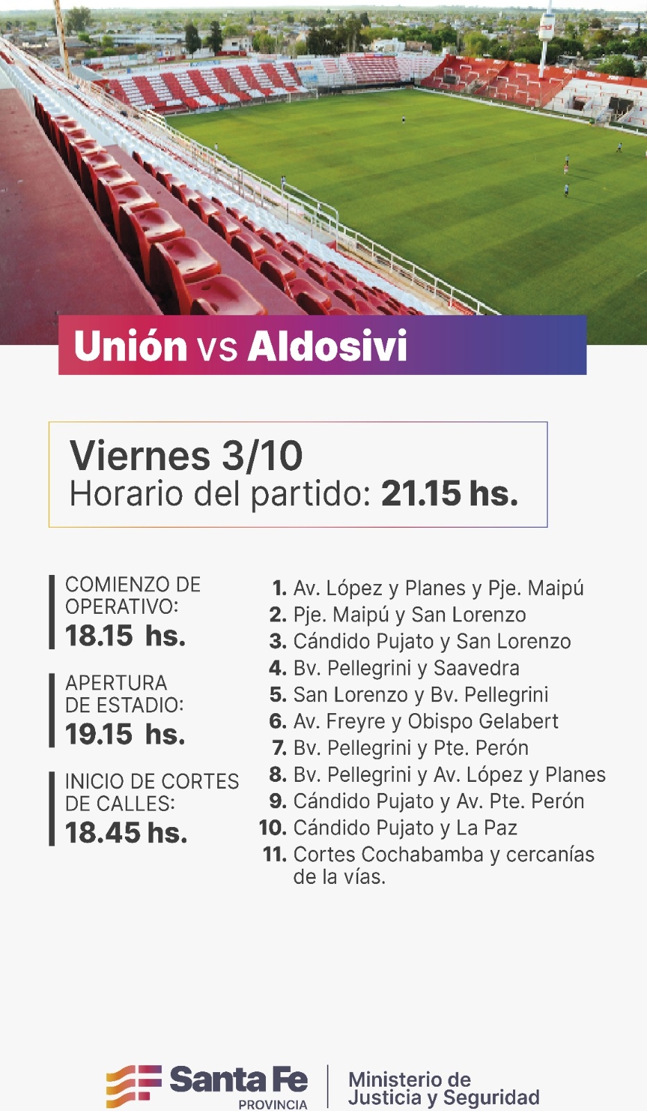 El Ministerio de Seguridad de la Provincia de Santa Fe dio a conocer los detalles del operativo de control y los cortes de tránsito que se implementarán este viernes por eel partido entre Unión y Aldosivi de la fecha 11 de la Zona A del Torneo Clausura.