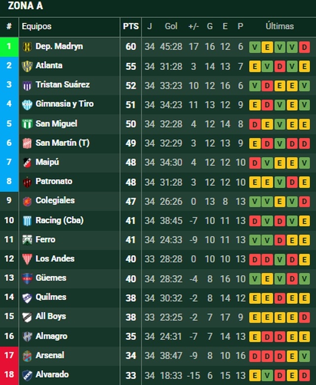 Por su parte, Deportivo Madryn ya se había asegurado el boleto directo a la final por el primer ascenso, tras haber finalizado en lo más alto del grupo. Los resultados del sábado: Ferro 3-Patronato 1, Almagro 0-Güemes 1, San Miguel 2-San Martín (T) 2, Quilmes 0-Tristán Suárez 1, Racing de Córdoba 1-Gimnasia y Tiro 2, Atlanta 0-Maipú 3 y Colegiales 1-Deportivo Madryn 0.