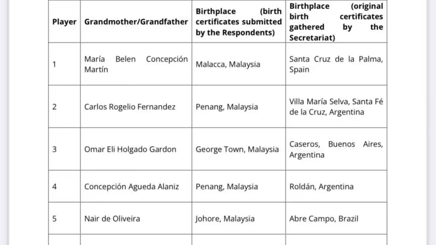 El organismo comparó los datos proporcionados por la Federación Malaya con registros oficiales argentinos. El resultado fue contundente: Carlos Fernández, abuelo de Garcés, es oriundo de Villa María Selva, Santa Fe, y nunca estuvo en Penang; y Concepción Agueda Alaniz, abuela de Machuca, nació en Roldán, Santa Fe, y no en Penang, como se había consignado.
