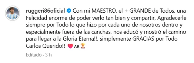 Compartiendo una foto junto con quien fue su director técnico en las redes sociales, Ruggeri lo catalogó como su “maestro” y “el más grande de todos” afirmando que le genera una felicidad enorme “poder verlo tan bien”.
