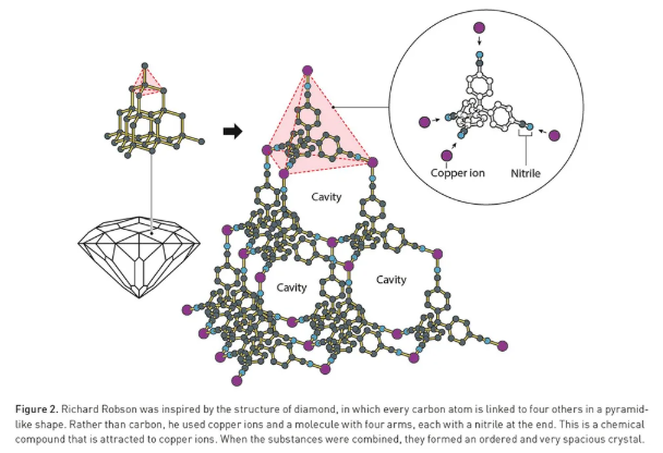 Todo comenzó en 1989, cuando Robson experimentó con el uso de las propiedades inherentes de los átomos de una forma novedosa. Combinó iones de cobre con carga positiva con una molécula de cuatro brazos; esta tenía un grupo químico que era atraído por los iones de cobre en el extremo de cada brazo.