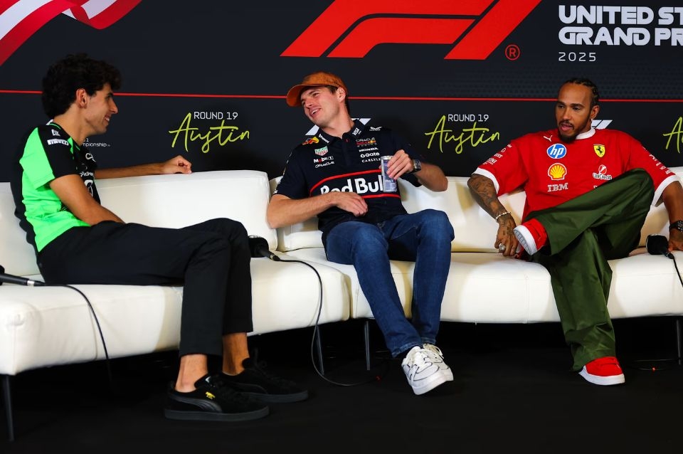 AUSTIN, TEXAS - 16 DE OCTUBRE: Gabriel Bortoleto de Brasil y el equipo de Stake F1 Kick Sauber hablan conVerstappen apareció junto a Gabriel Bortoleto y Lewis Hamilton en la conferencia de prensa de pilotos del jueves