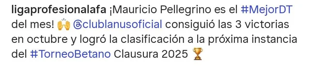 “Mauricio Pellegrino es el Mejor D.T del mes. El Club Lanús consiguió las 3 victorias en octubre y logró la clasificación a la próxima instancia del Torneo Clausura 2025”, manifestó la cuenta oficial de la LPF en la descripción de su publicación de redes sociales.