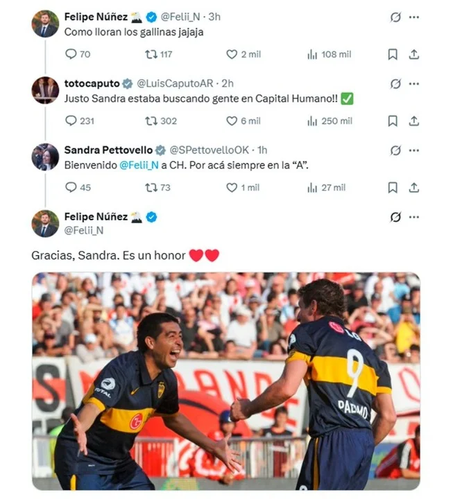 En este contexto, Felipe Núñez, integrante del equipo ecónomico de Milei, tuiteó en la red social X: “Como lloran las gallinas jajaja”. Quien recogió el guante fue el ministro de Economía que le contestó: “Justo Sandra (Pettovello) estaba buscando gente en Capital Humano!!”