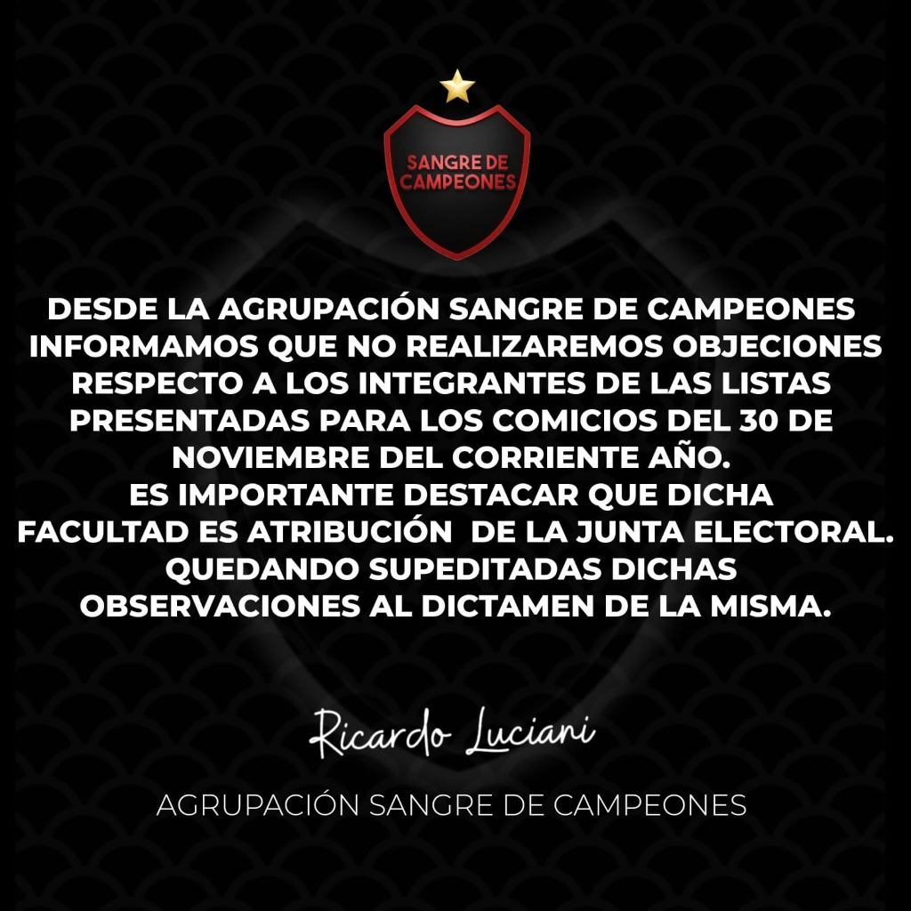 La agrupación Sangre de Campeones confirmó en las últimas horas que no presentará objeciones a las listas que competirán en las elecciones de Colón del próximo 30 de noviembre. La decisión, comunicada de manera oficial, marca una postura clara en la previa del acto electoral y busca enviar un mensaje de confianza.