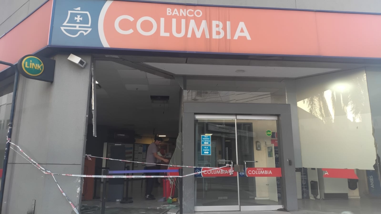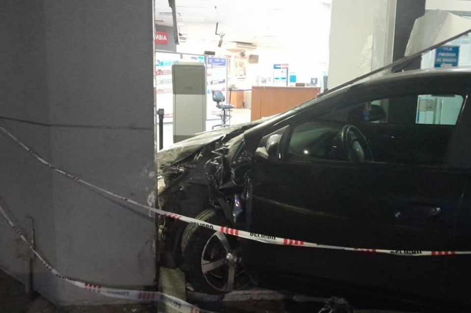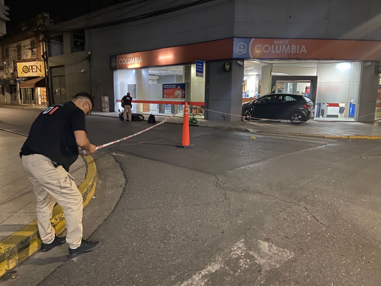 Un automovilista y un motociclista protagonizaron un accidente en la madrugada de este jueves en la intersección de San Jerónimo y La Rioja. Producto del impacto, el auto se subió a la vereda y terminó impactando contra la fachada de una sucursal del Banco Columbia.