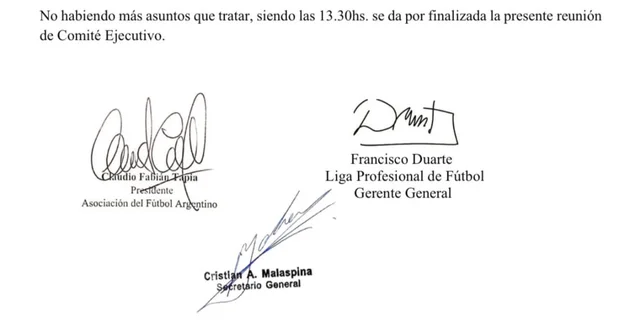 Poco después de la confirmación de la nueva estrella para los “Canallas” se publicó el acta oficial que da cuenta de la reunión mencionada, la cual contó con la firma al pie del mencionado Tapia, el gerente general de la Liga Profesional de Fútbol (LPF) Francisco Duarte y el secretario general de AFA, Cristian Malaspina.