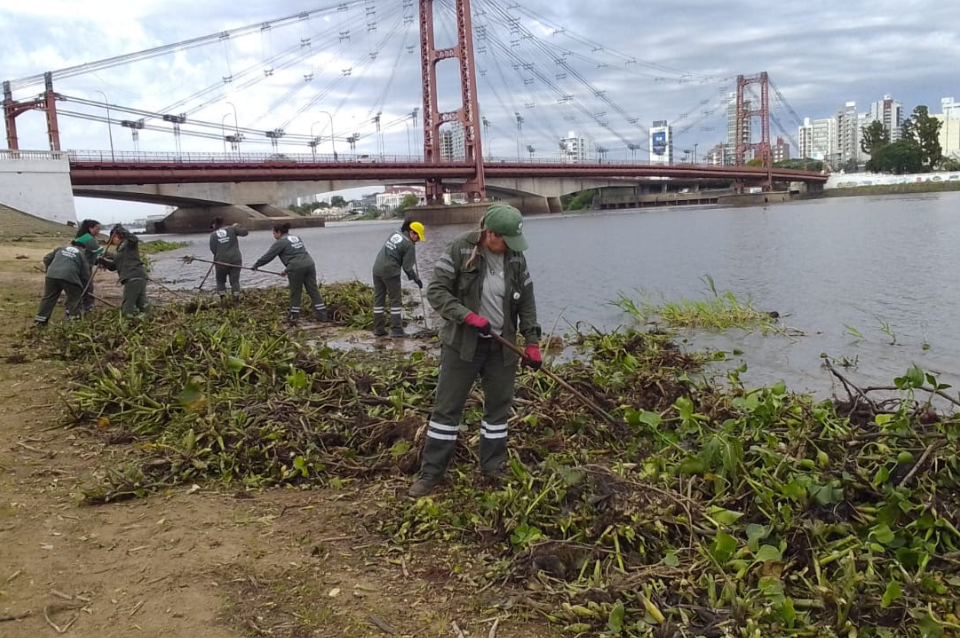 Personal municipal de las secretarías de Gestión Urbana y Ambiente y de Políticas Sociales realizó el retiro manual de camalotes, el rastrillaje y la limpieza desde la orilla, en tanto el cuerpo de guardavidas municipal acompañó el trabajo desde lanchas y orientó a los camalotes para que continúen su circulación aguas abajo.