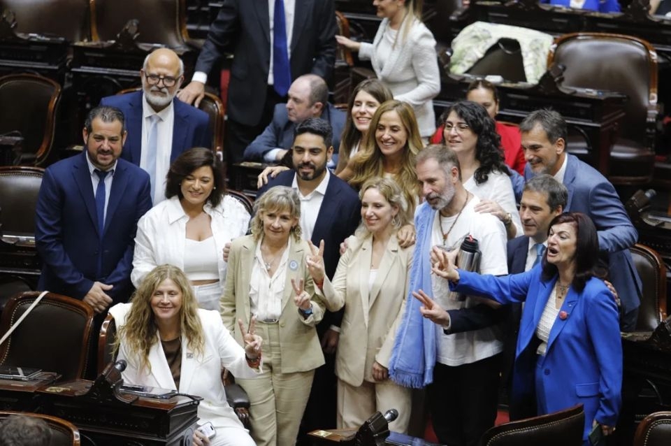“¡Presidente! ¡Presidente!”, respondieron desde la bancada de LLA ante un Milei que cantaba y festejaba, mientras Karina Milei aplaudía y otros invitados partidarios del Gobierno también lo hacían.