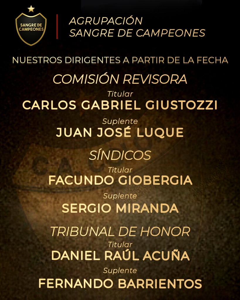 La agrupación anunció quiénes serán sus representantes durante los próximos dos años, distribuidos en los distintos espacios de control: Carlos Giustozzi (comisión revisora), Juan José Luque (suplente comisión revisora), Facundo Giobergia (síndico titular), Sergio Miranda (síndico suplente), Daniel Acuña (titular tribunal de honor) y Fernarndo Barrientos (suplente tribunal de honor).