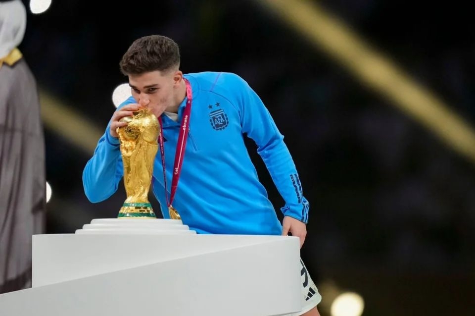 En la imagen compartida aparecen jugadores jugadores que surgieron del club y que formaron parte de los héroes de Qatar, como los defensores Germán Pezzella y Gonzalo Montiel, los mediocampistas Guido Rodríguez, Enzo Fernández y Exequiel Palacios, y el delantero Julián Álvarez.