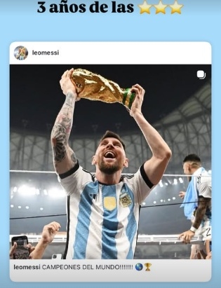 Lionel Messi compartió una historia de Instagram por los tres años de la Selección Argentina en el Mundial de Qatar 2022. El capitán, que tuvo una inolvidable actuación en el último Mundial, compartió la publicación de aquel inolvidable 18 de diciembre de 2022, que es la más likeada en la historia de Instagram.
