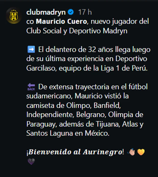 La confirmación se dio a conocer a través de un comunicado oficial difundido por la institución aurinegra, en el que se detalló la llegada del delantero y se destacó su recorrido profesional. “Mauricio Cuero, nuevo jugador del Club Social y Deportivo Madryn. El delantero de 32 años llega luego de su última experiencia en Deportivo Garcilaso, equipo de la Liga 1 de Perú. De extensa trayectoria en el fútbol sudamericano, Mauricio vistió la camiseta de Olimpo, Banfield, Independiente, Belgrano, Olimpia de Paraguay, además de Tijuana, Atlas y Santos Laguna en México. ¡Bienvenido al Aurinegro!”, expresó el club.