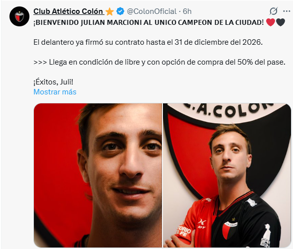 Con la llegada de Marcioni, el Sabalero suma experiencia, movilidad y gol a un plantel que se sigue armando con el claro objetivo de ser protagonista. El mensaje del club fue claro y contundente: Colón está de pie y refuerza su ilusión.