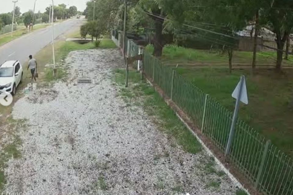 En el video se observa a un hombre llegar al lugar a bordo de un automóvil, descender con tranquilidad y, utilizando una pala y varios baldes, comenzar a cargar las piedras ornamentales que el artista tenía desparramadas en el ingreso a su vivienda.